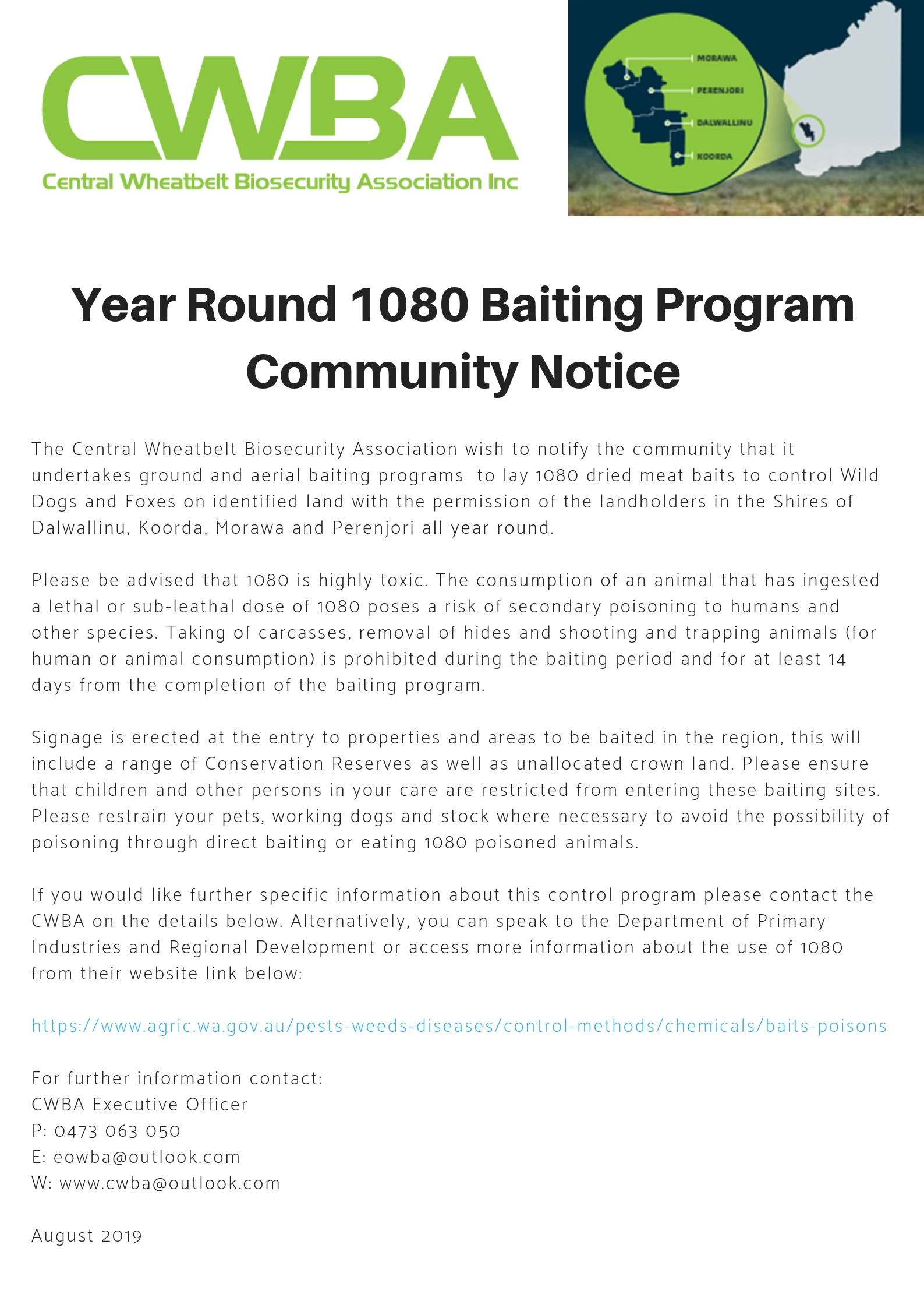 The CWBA is a recognised biosecurity group (RBGs) and has a key role in assisting landholders to control declared pests in the area of management. This area is currently defined, as Koorda, Perenjori, and Dalwallinu and Morawa which encompasses a full area of 21,901 square kilometres.