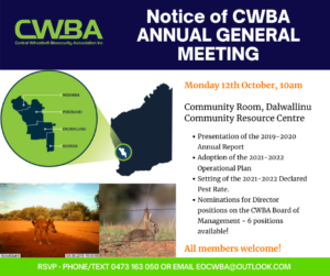 All welcome to attend the 2020 Annual General Meeting, 10am in Dalwallinu on Monday 12th October at the Community Room, Dalwallinu Community Resource Centre. The principal role of the CWBA Board of Management at the AGM is the setting of the annual Declared Pest Rate, Operational Plan, and associated activities.